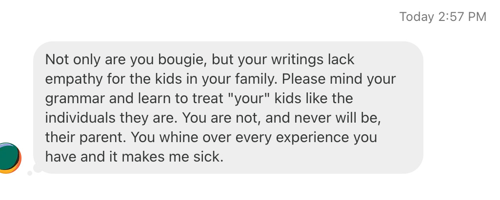 At first, I got defensive. She sent this when my last three posts hadn’t even been about my kids. And I have tremendous empathy for the kids in my family — she doesn’t even have all the context on how much we’ve navigated together and how far we’ve come! I’m not necessarily going to argue with someone about how “bougie” I am, but when I ignore a grammatical rule it’s usually deliberate to allow for my own natural voice and its many, many tangents.